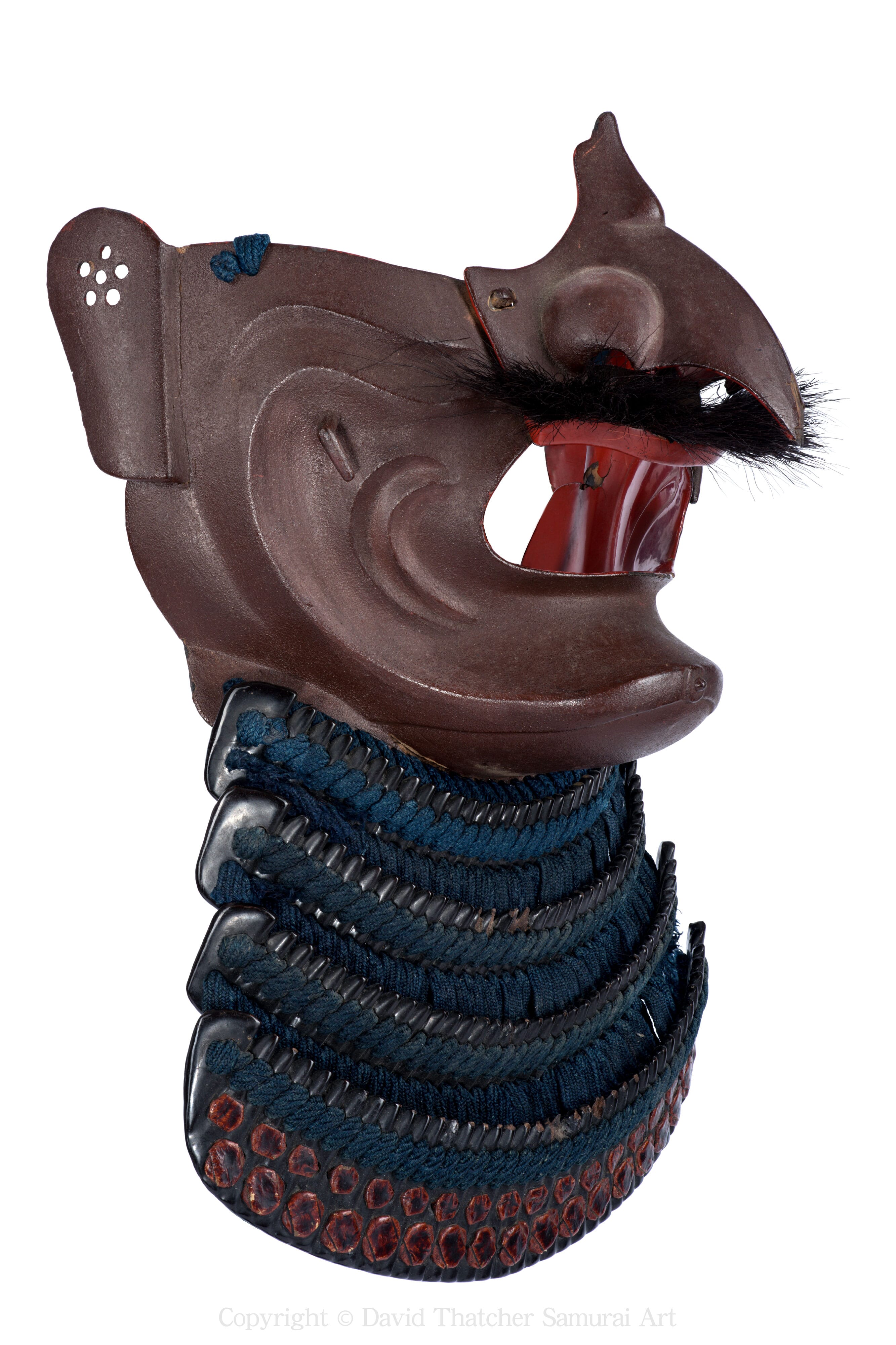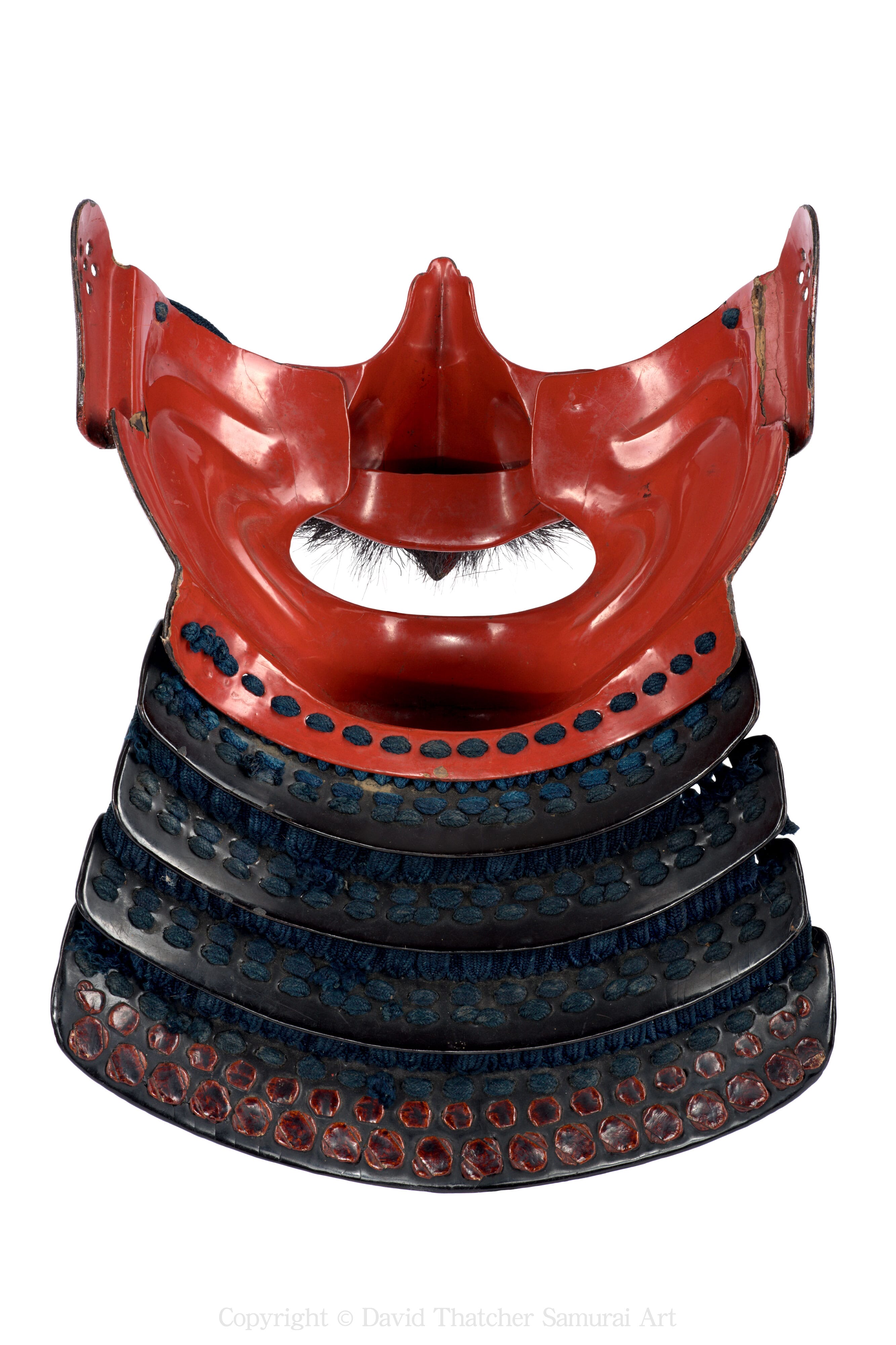 The yodarekake comprises five iron lames constructed in kiritsuke kozane form and finished in black lacquer. Lacing is executed in kebiki odoshi, creating a firm and visually balanced throat guard. The terminal plate, the mune zurino ita, is lacquered red and finished with hishinui cross knot lacing, providing a strong visual counterpoint to the darker upper sections.